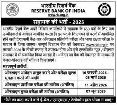 RBI Assistant Recruitment 2026- भारतीय रिज़र्व बैंक (RBI) की ओर से वर्ष 2026 में Assistant पदों पर बंपर भर्ती का आधिकारिक नोटिफिकेशन जारी कर दिया गया है। इस भर्ती के अंतर्गत देश भर के विभिन्न RBI कार्यालयों में कुल 650 पदों पर योग्य उम्मीदवारों की नियुक्ति की जाएगी।जो अभ्यर्थी सरकारी बैंक नौकरी की तैयारी कर रहे हैं, उनके लिए यह भर्ती एक बेहतरीन अवसर है।